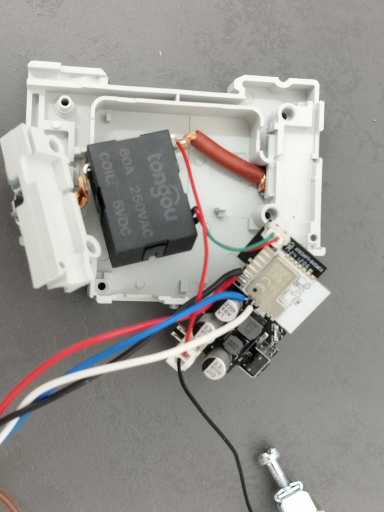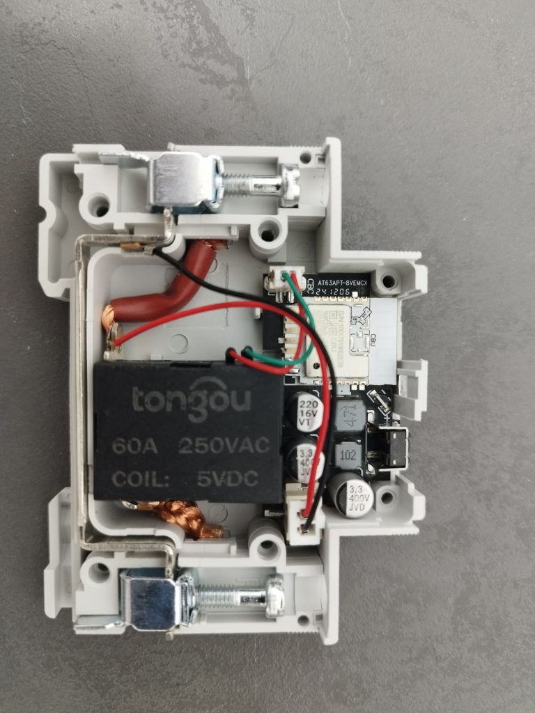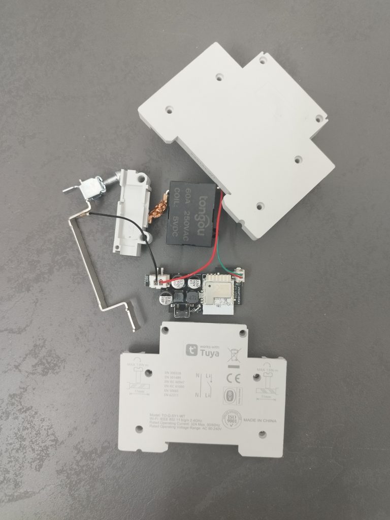 As you’ll see below, I had to open the smart unit and discovered a relay inside. That relay is not able to interrupt current while the circuit is under load. Anyway, after inspecting the board I found it runs on the Tuya platform. Since I had Home Assistant (HA) running on my local network, I wanted Home Assistant to communicate with the breaker directly. Tuya-based smart devices normally work like this: you control the device from a phone app (SmartLife, for example), the device is registered on Tuya’s cloud servers during setup, and your phone sends on/off requests to Tuya’s servers, which then forward them to the device — in other words the device relies on the internet. If the internet goes down, there is a local key stored both in the device firmware and in the SmartLife app that allows you to control the device locally over your LAN. This behavior is common to most Tuya-based products.