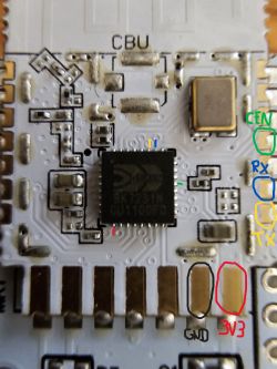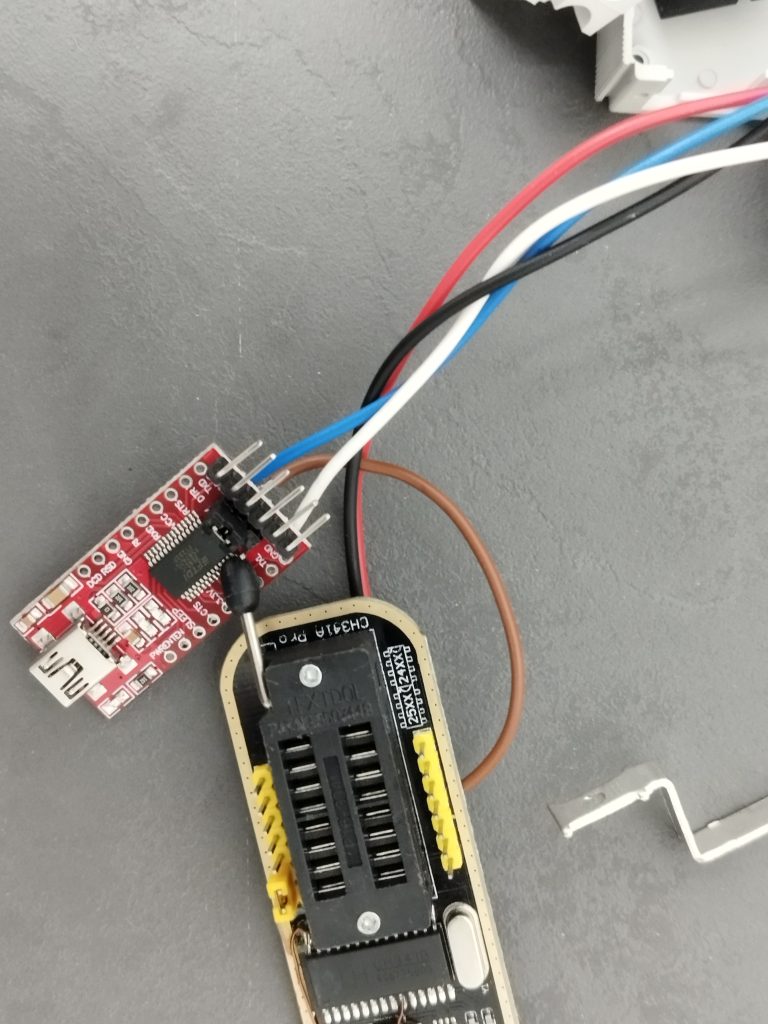 The two lower pins — red and black — are 3.3 V and GND respectively, while the yellow pin is TX and the blue pin is RX. Ignore the green pin. I used an FT232RL module to connect the board to my computer. Note: the FT232RL module cannot supply 3.3 V reliably by itself, and applying 5 V to the target board will destroy it. I therefore used a different programmer board that could provide 3.3 V. You can also use a bench power supply (I didn’t have one available at the time). Remember that the device RX must be connected to the programmer TX and the device TX to the programmer RX. After wiring, download and run the OpenBK software on your computer.
